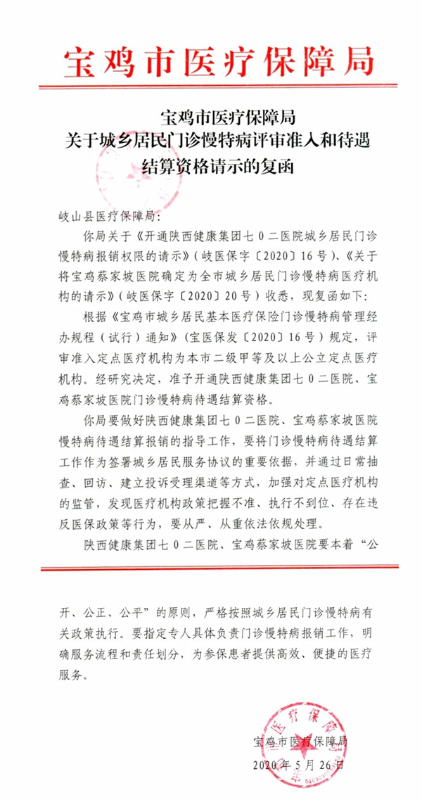 为了更好的服务于岐山周边居民,宝鸡蔡家坡医院特向宝鸡市医疗保障局申请“城乡居民门诊慢特病结算资格”。宝鸡市医疗保障局于2020年5月26日正式批准我院门诊慢特病待遇结算资格。