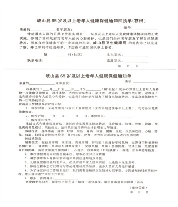 3、岐山县65岁及以上老年人健康保健通知单如下:
